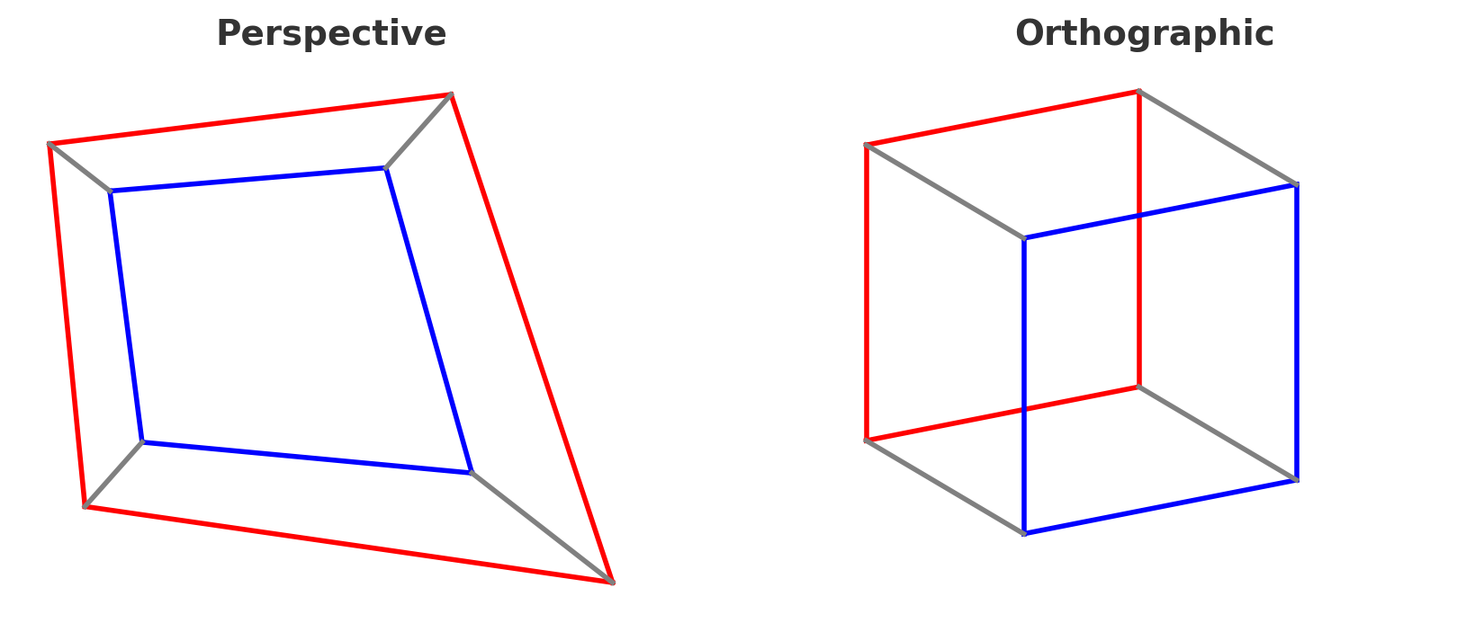 위 그림은 원근 투영과 정투영의 차이를 간단히 보여줍니다. 왼쪽은 원근 투영으로 본 큐브(정육면체)이고, 오른쪽은 정투영으로 본 모습입니다. 왼쪽 그림에서는 앞쪽 면의 빨간 테두리가 크게 보이고, 뒤쪽 면의 파란 테두리는 멀어지면서 작아져 내부의 작은 사각형처럼 보입니다.